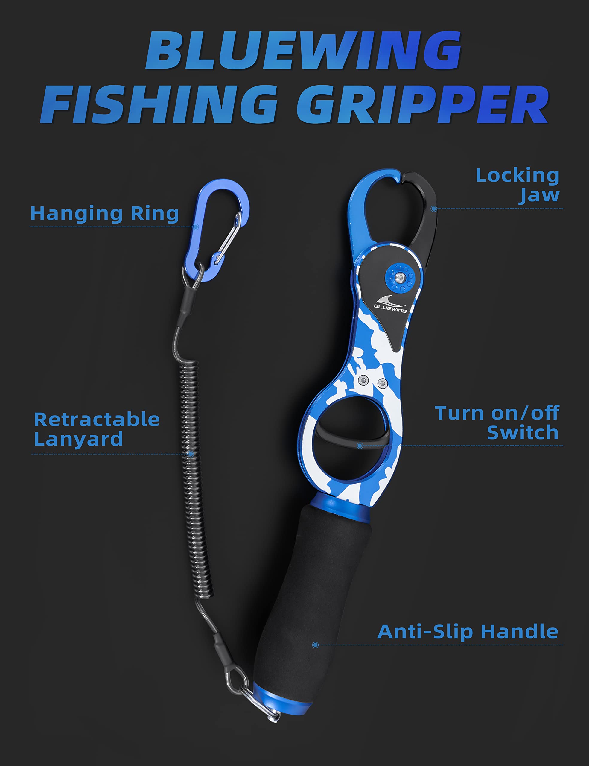 BLUEWING 10 Inch Fishing Gripper 1pc Aluminum Alloy Fish Lip Catcher Grabber with Coiled Lanyard