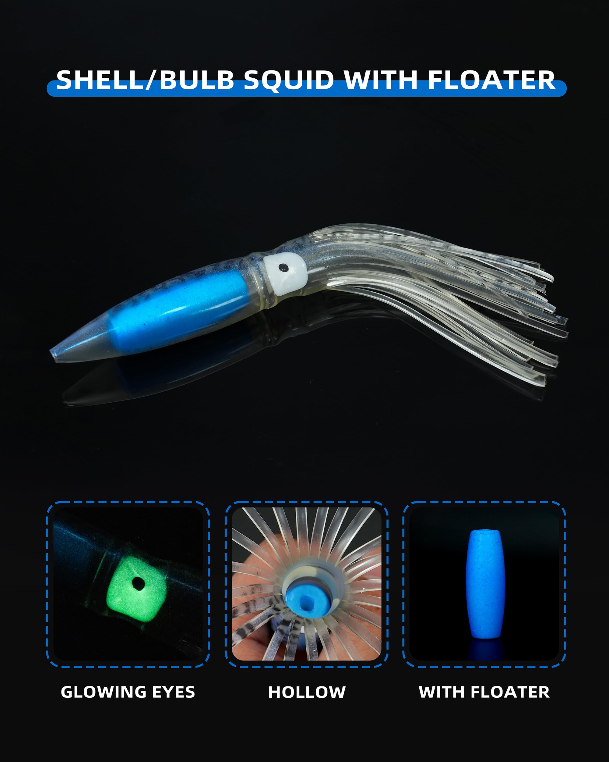 - Floating Ball: The bulb squids have foam floats that help squids float. They can be removed to use the squid lures for different rigging applications.