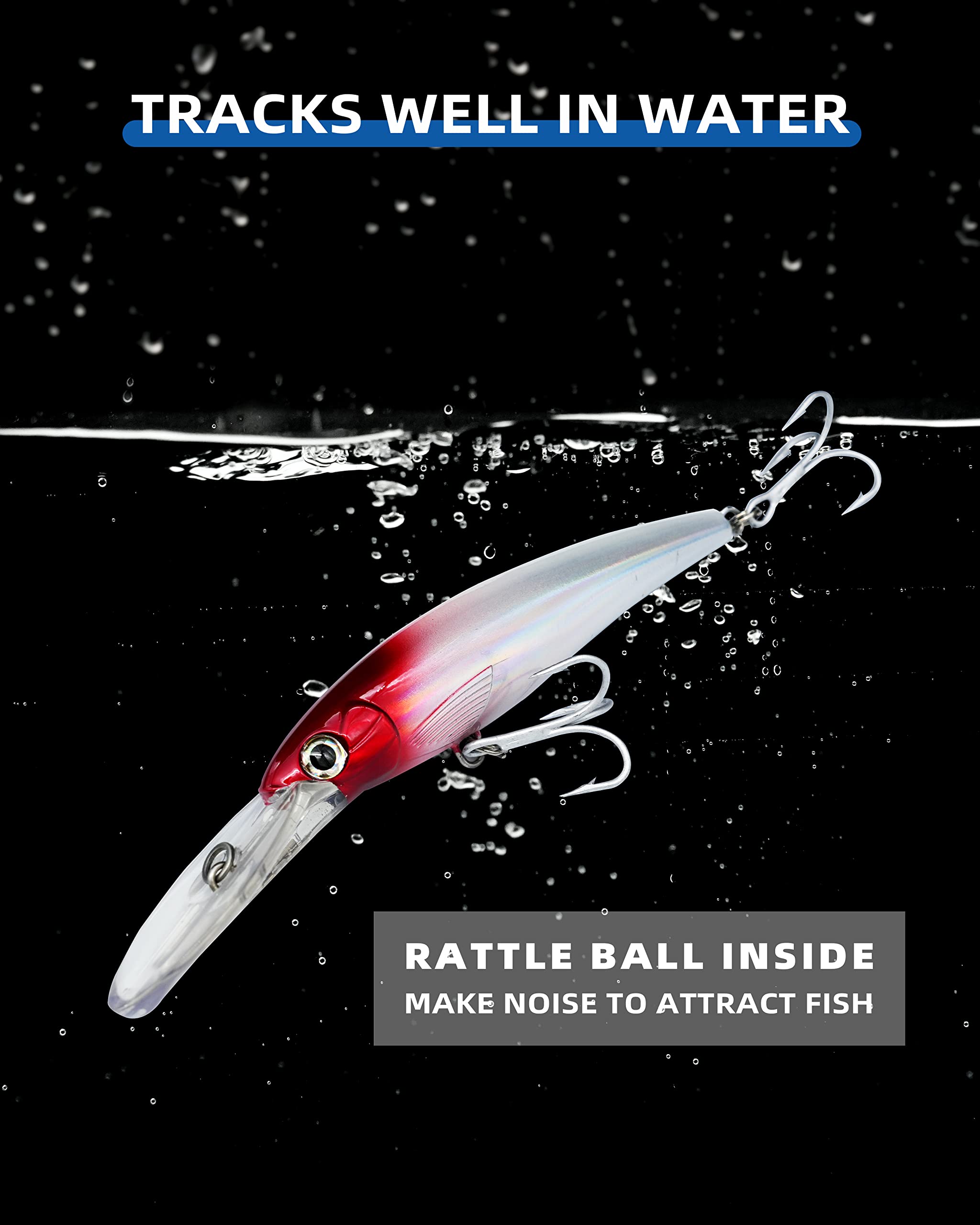- Rattle Ball Inside: A steel ball inside the lure makes noise to attract fish, and keep the fishing lure tracking true in the water.