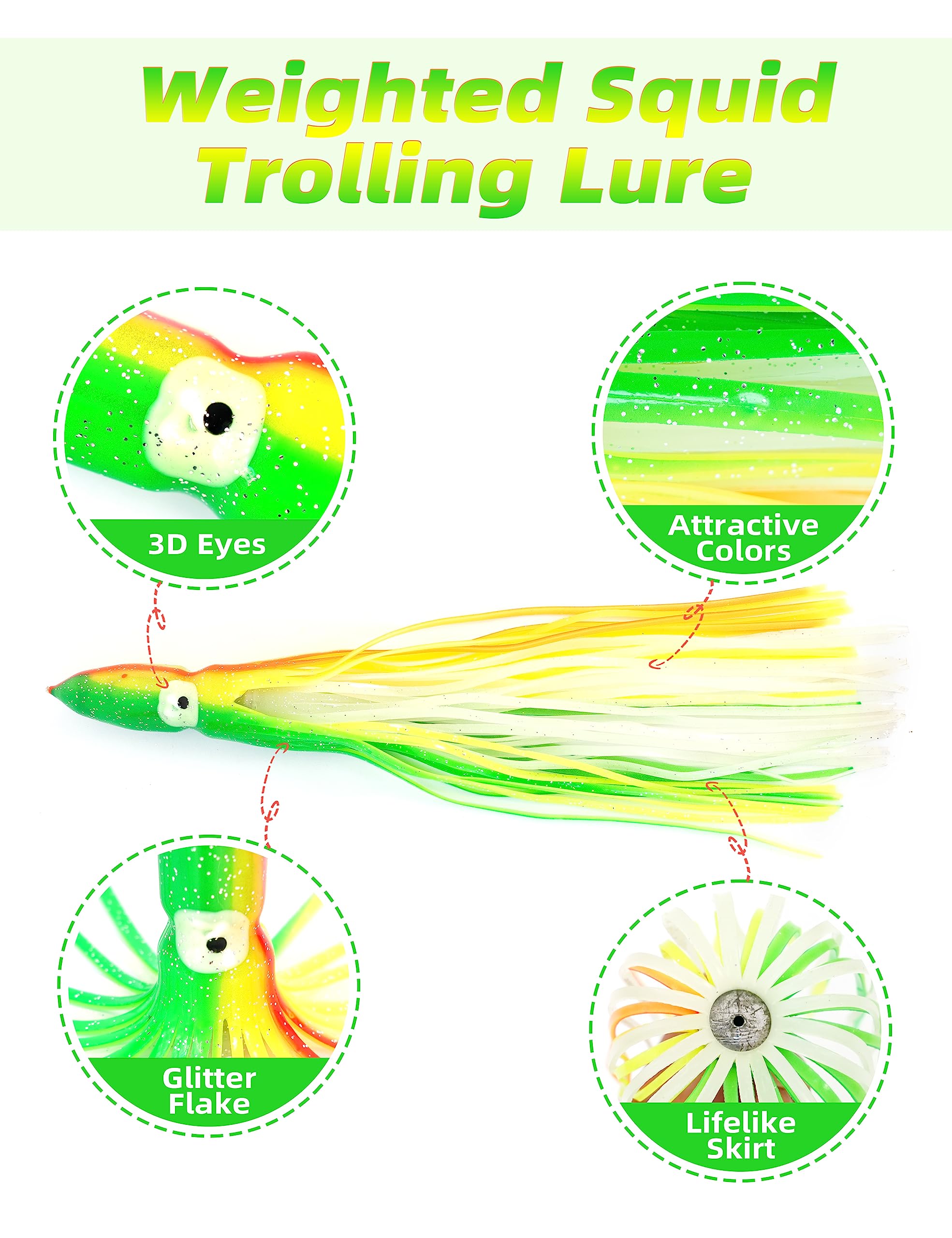 - Weighted for Precision Trolling: The squid embedded inside has a lead head and a luminous skirt, which ensures optimal balance and stability, allowing the squid lure to swim at the perfect depth and maintain a consistent and enticing presentation.